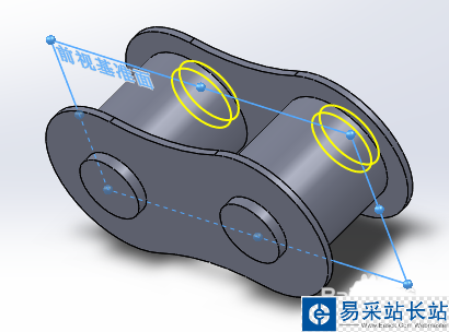 2、在一對滾子所在平面建立草圖,繪制出鏈板的草圖,如圖所示。然后拉伸得出滾子一側(cè)鏈板。