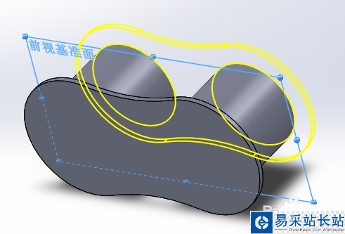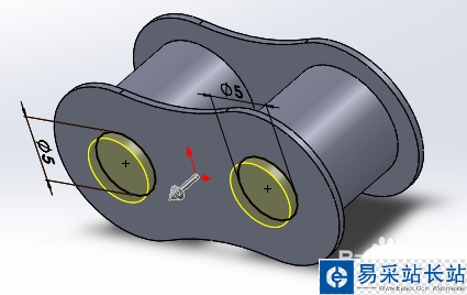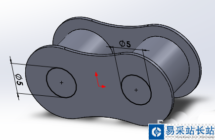4、為鏈板添加銷軸外型。在鏈板上畫兩個圓,拉伸得到銷軸外型。然后使用鏡像指令得出對稱的銷軸外型。