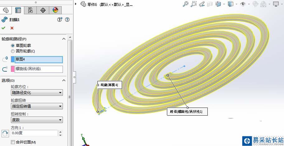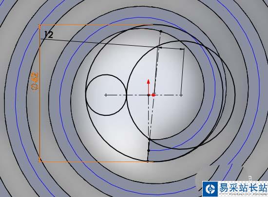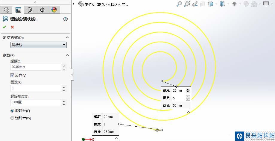 2、使用螺旋線/渦狀線命令,通過圓形草圖創建渦狀線。