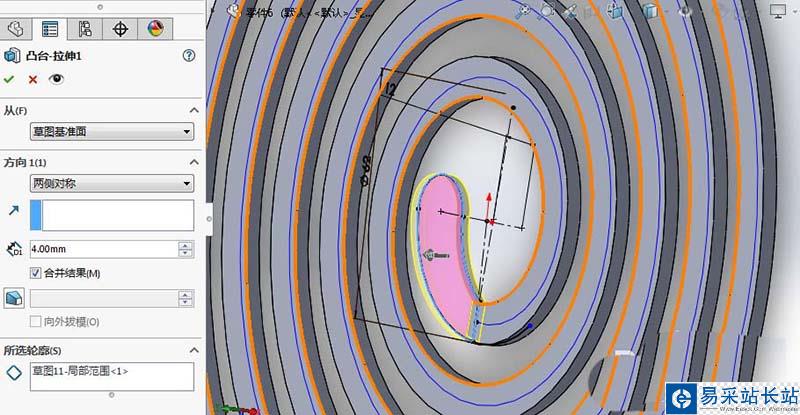 6、使用拉伸凸臺命令,得到蚊香頭的模型。