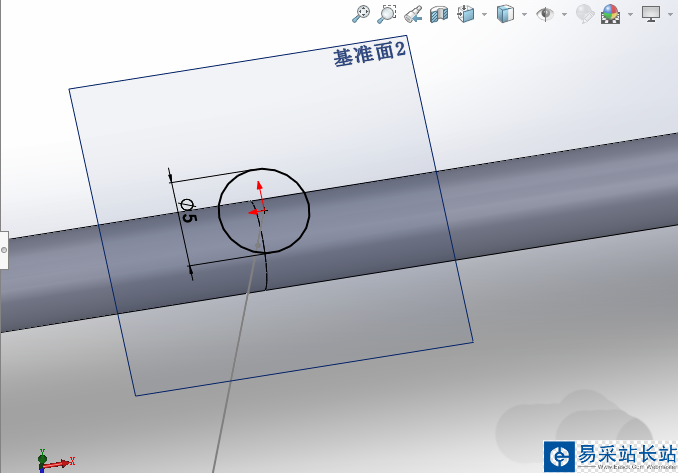 2、然后在一端的垂直面上建立基準(zhǔn)面,并在該面上畫圓。