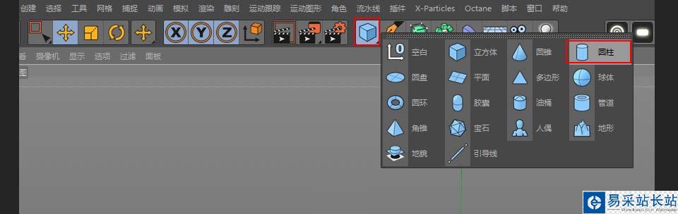 在菜單欄找到立方體圖標,按住立方體圖標,出現下拉菜單,選擇圓柱,點擊。