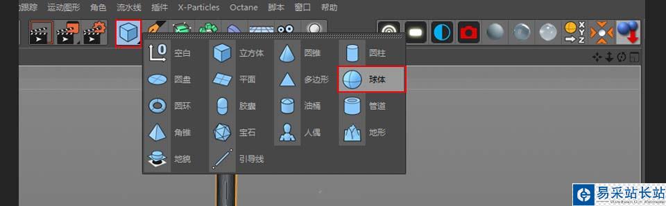 在菜單欄找到立方體圖標,按住立方體圖標,出現下拉菜單,選擇球體,點擊。