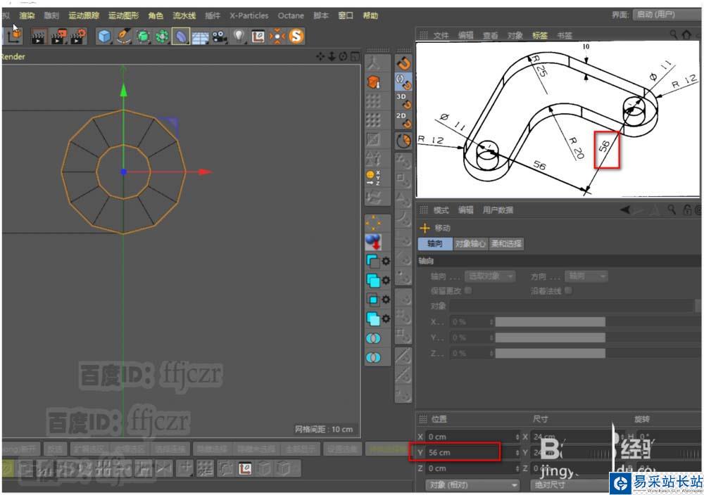 6、創建一個圓盤,內部半徑為5.5,外部半徑為12;圓盤分段為1,旋轉分段為12,方向為+z。將圓盤轉為可編輯多邊形,在對象坐標中調整Y軸的值為56,其它為0。復制圓盤,將其坐標的X軸修改為-56,其余為0.