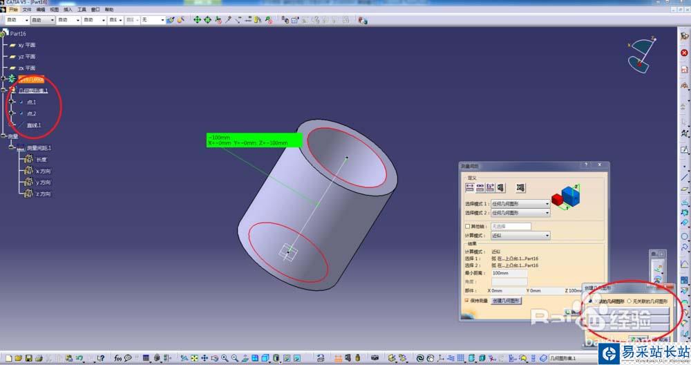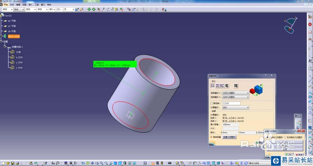 3、選擇模式“任何幾何圖形”,分別選取圓柱底部圓心和頂部圓心進行測量;