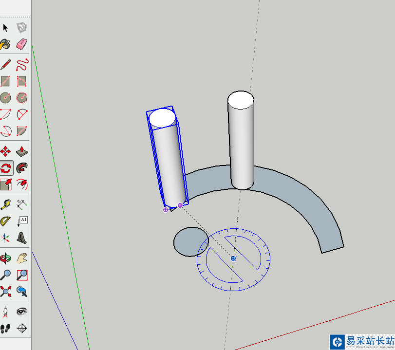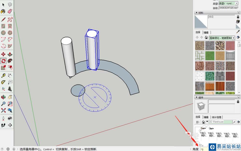 4、先選中整個(gè)圓柱體,添加組件,然后選中圓柱體組件,找到圓弧的中心,然后使用旋轉(zhuǎn)工具,快捷鍵為Q,按住ctrl,輸入角度或者鼠標(biāo)移動(dòng)控制放到適當(dāng)?shù)奈恢镁涂梢粤恕?/p>