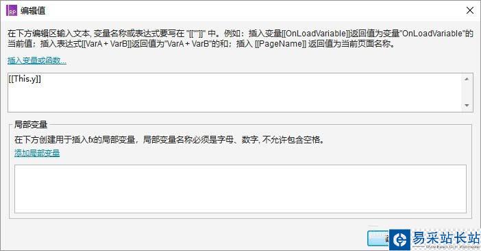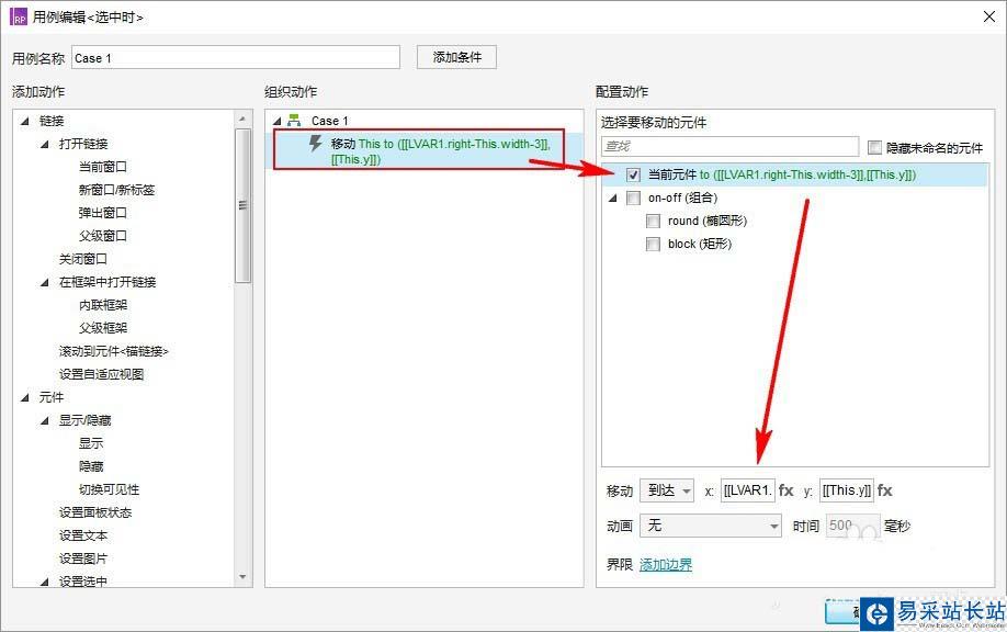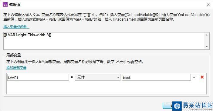 設置“元件:block”為局部變量LVAR1,所以X的值為[[LVAR1.right-This.width-3]]