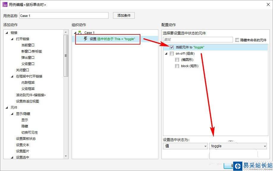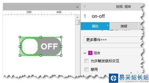 布局、組合結束后,下來就是”開關“按鍵的交互動作。”組合:on-off“的”鼠標點擊時“的交互動作:設置”當前控件“的選中狀態為”切換(toggle)“方式