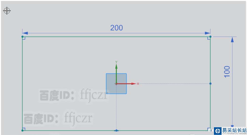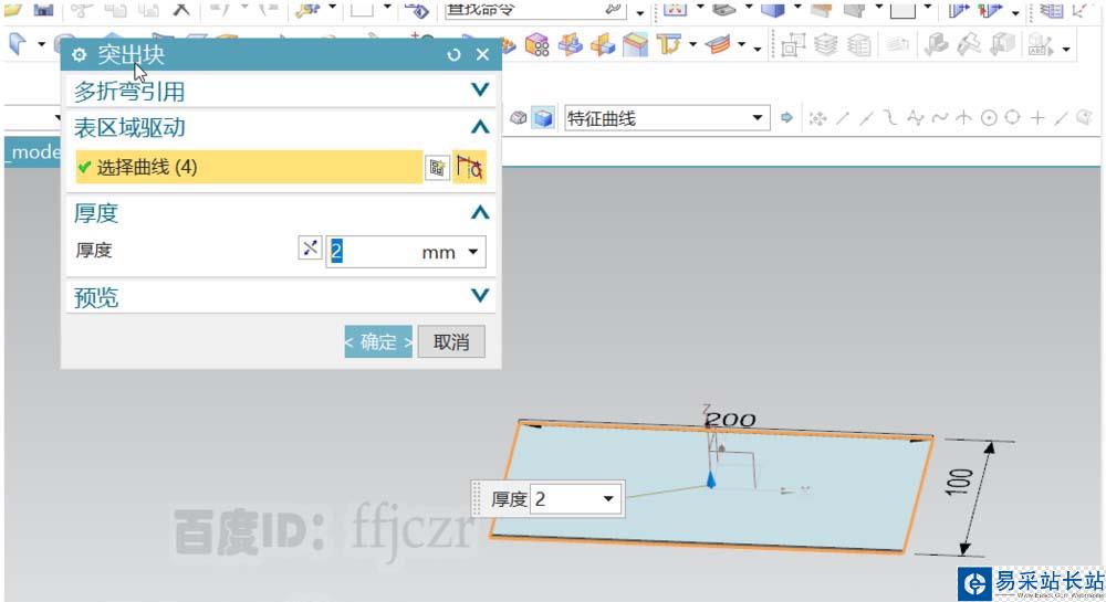 1、和現實的鈑金加工一樣,首先得有材料才能折彎。這里的材料就是突出塊了。選用突出塊命令,在XY面上繪出突出塊的截面圖;一個中心點與坐標原點重合的矩形,長為200寬為100.突出塊的厚度為2.