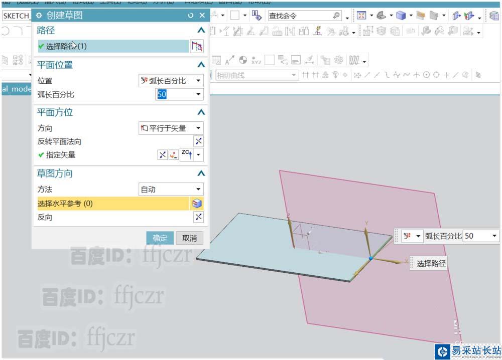 2、選用輪廓彎邊,選繪制截面,在彈出的對話框中隨意選用突出塊上表面的一條邊作為路徑,弧長50%,使設定的坐標與世界坐標軸平行,這里與Z軸平行。