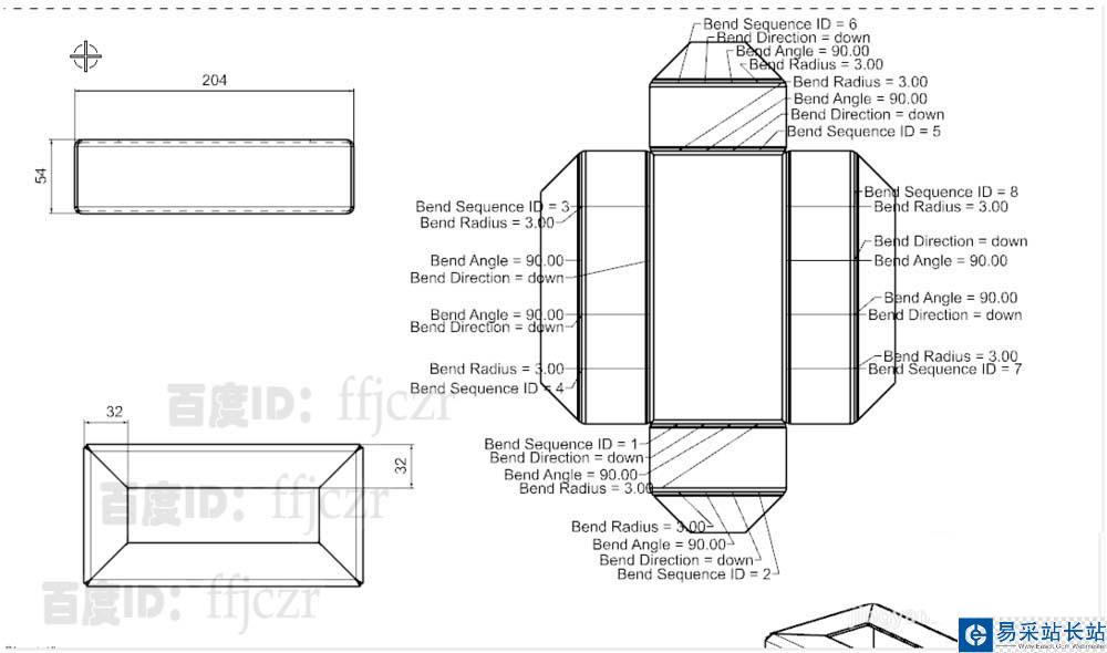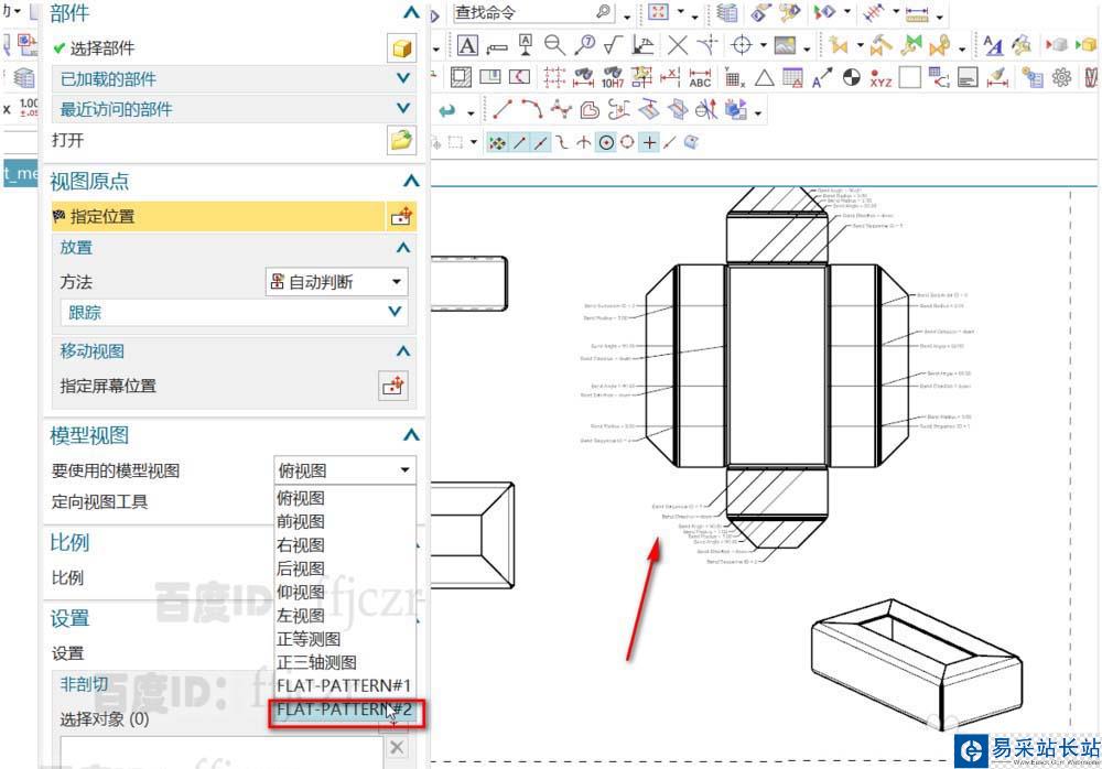 6、工程圖模式中,導入俯視圖和前視圖后,導入展開圖,模型十分簡單,但其展開圖卻是十分重要,可以很好的指導樣品的生產制作。