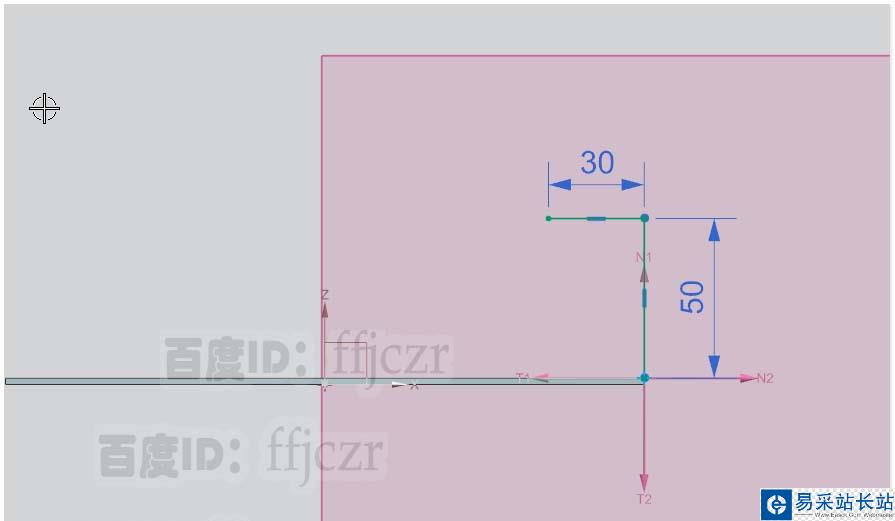 3、在草圖中,以新的坐標原點為參考,繪出二段相連的直線(數據如圖所示),這便是輪廓彎邊的截面線。