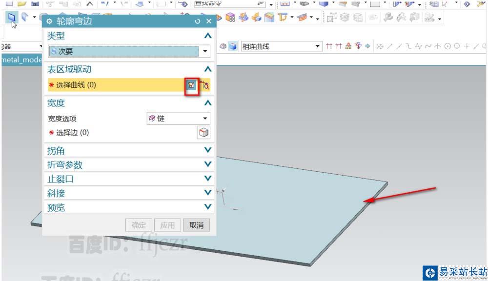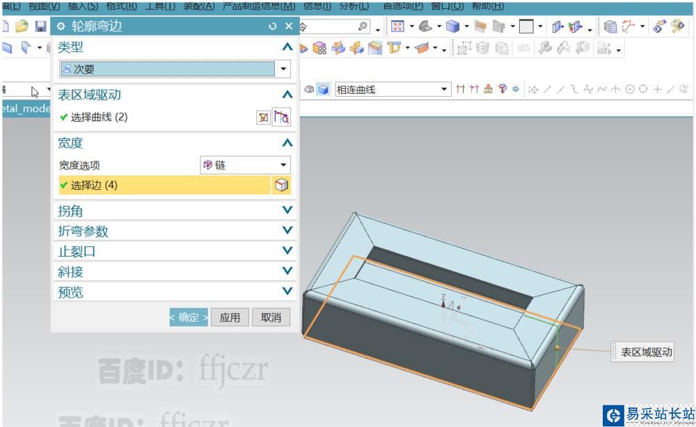 4、回到輪廓彎邊對話框,其中的寬度選項修改為鏈,選擇模式為相連曲線;用鼠標選擇突出塊上表面的輪廓邊。軟件根據上步繪的輪廓截面線自動生成折彎面。
