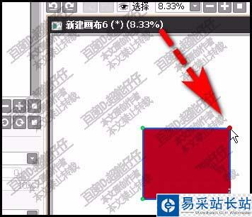 3、此時(shí),畫布中的矩形的四個(gè)角,顯示出錨點(diǎn)。鼠標(biāo)放在錨點(diǎn)上,此錨點(diǎn)變成紅色。
