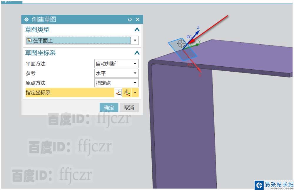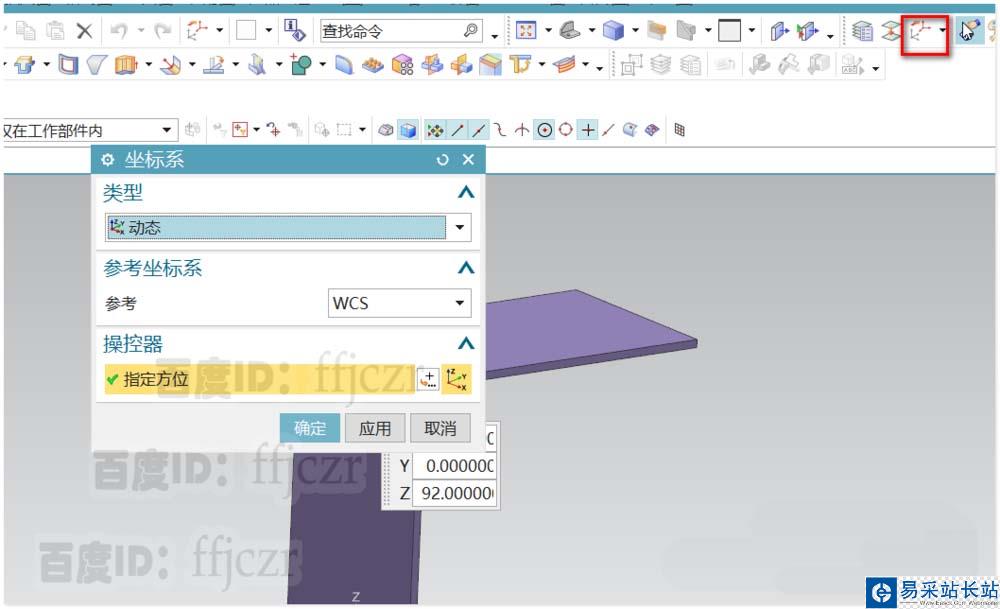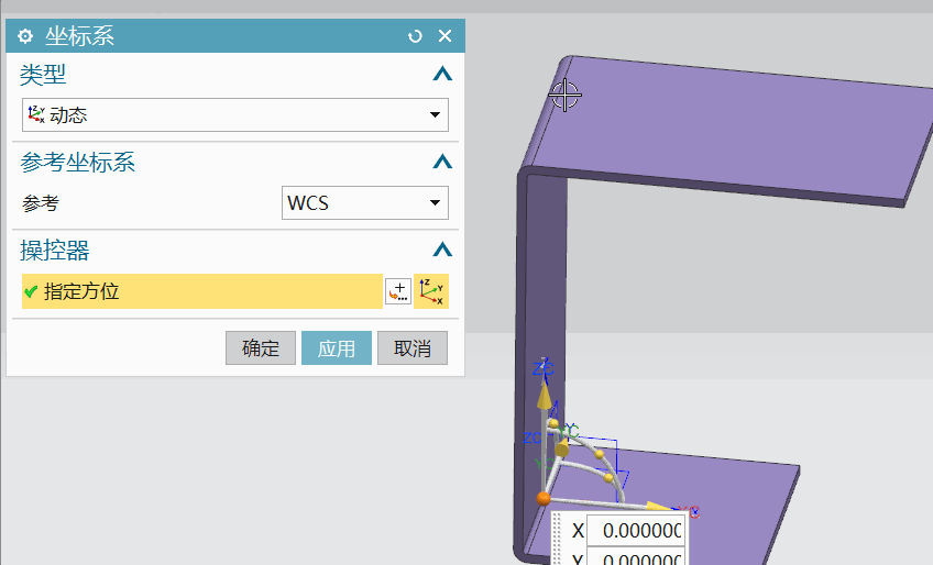 3、選用WCS定向,類型為動態(tài)。在折彎件的上直角邊中點(diǎn)處新建一個45度傾斜的坐標(biāo)。