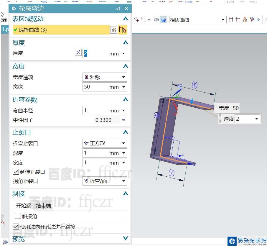 成草繪后,在輪廓彎邊對話框中設(shè)置折件的厚度為2,寬度選項(xiàng)為對稱,寬度為50;確定后得到一個折彎件。