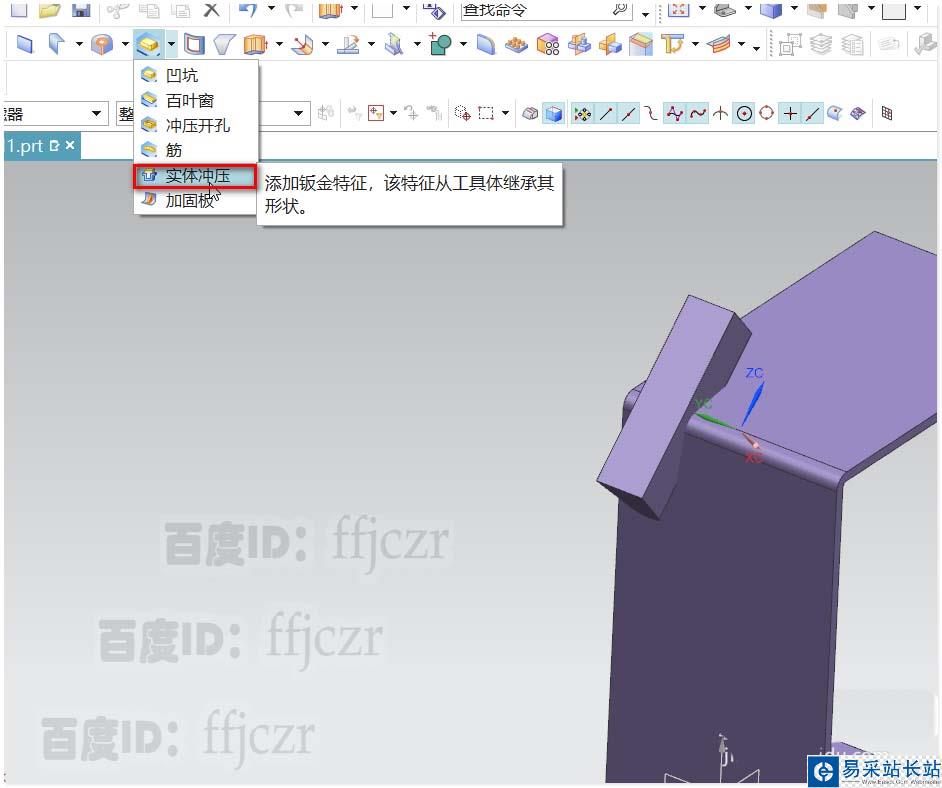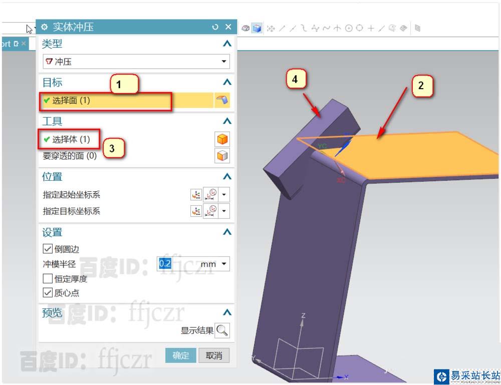 7、選用實(shí)體沖壓,對話框中的目標(biāo)面為折彎件上的外表面,工具體為上步創(chuàng)建的實(shí)體;沖壓半徑為0.2,確定后得到折件中的一個加強(qiáng)筋。