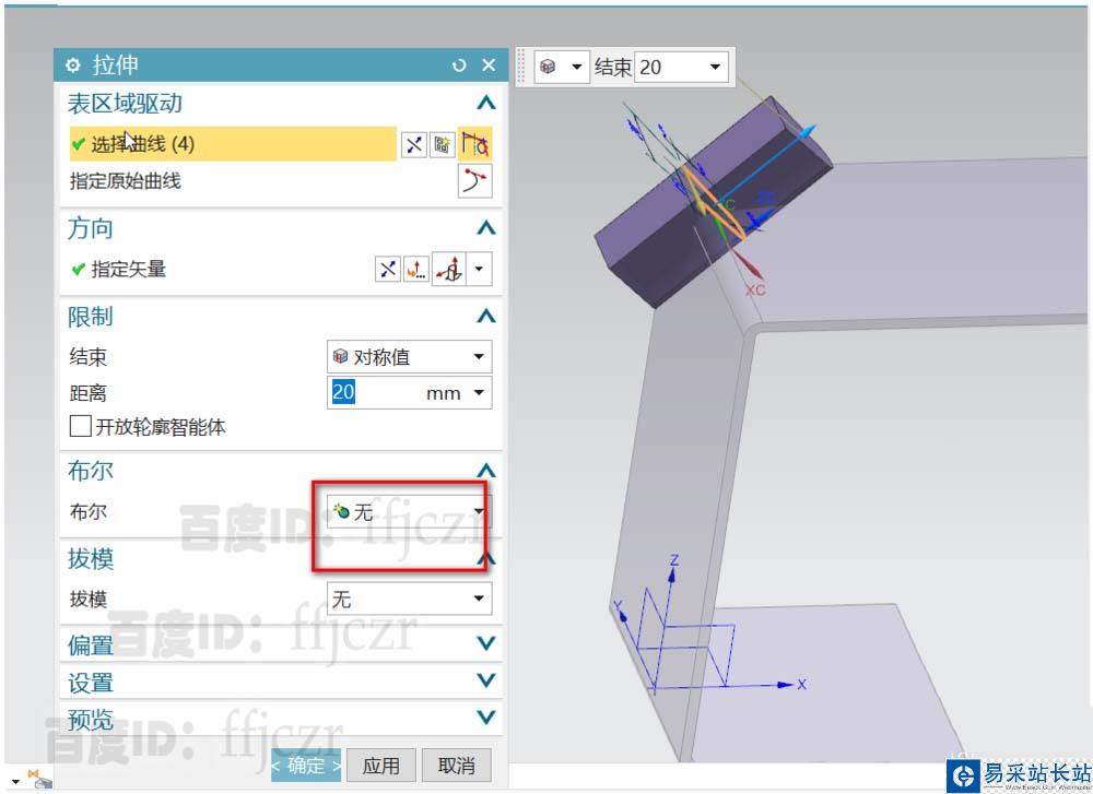 6、完成草繪后,回到拉伸對話框,類型為對稱,值為20;不要選用布爾運(yùn)算。得到?jīng)_壓用的工具體。