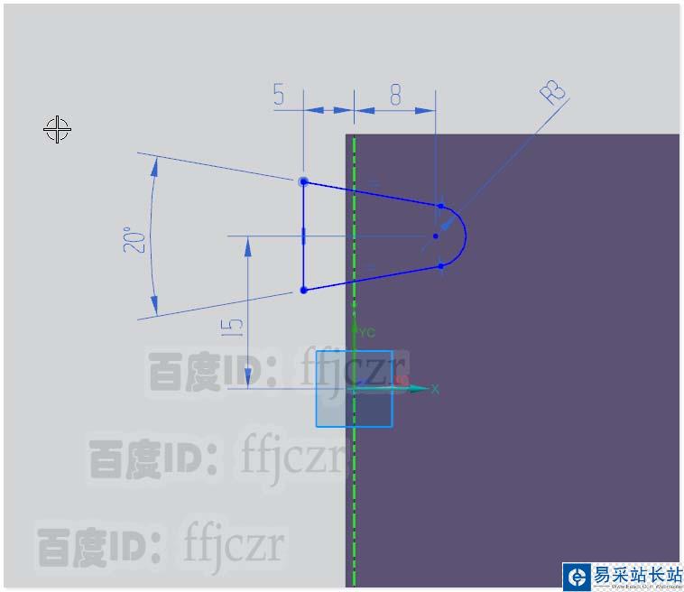 5、用標(biāo)注對上步繪的輪廓進(jìn)行約束定位,輪廓線圓弧的半徑為3,兩條相等長度的切線形成的角度為20度,圓心到X軸的距離為15,到Y(jié)軸的距離為8;與Y軸平行的豎線距離Y軸5cm. 草圖完全約束,完成草繪。