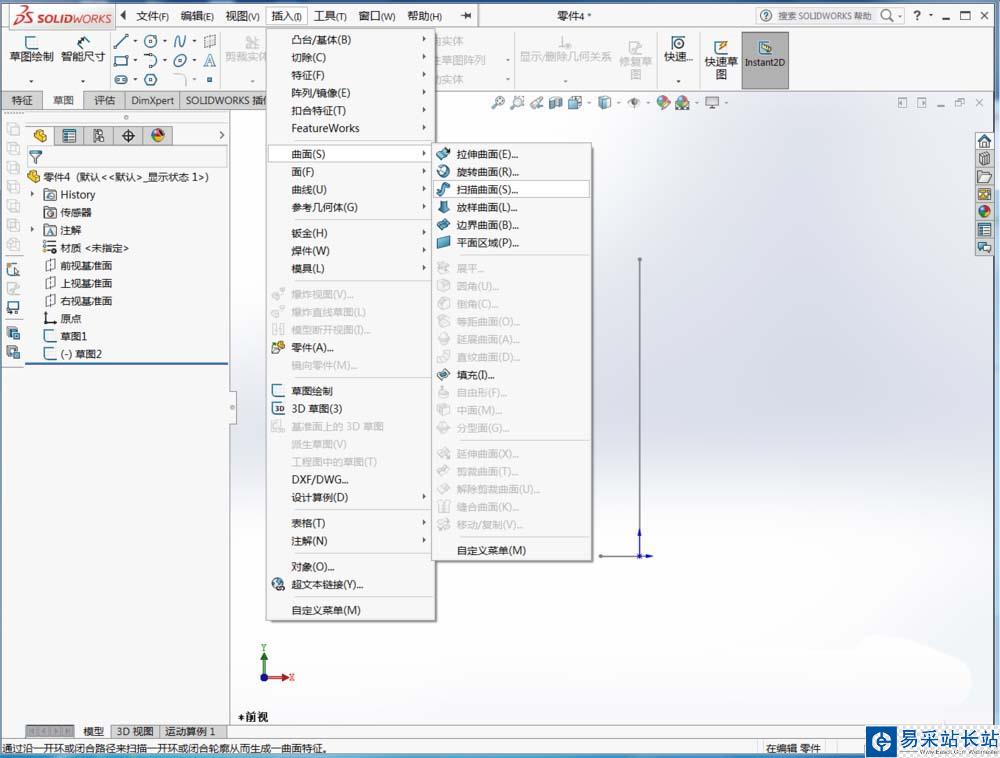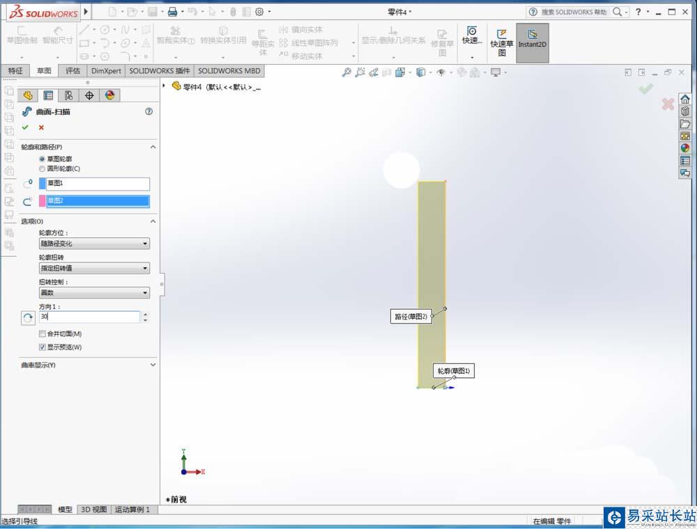4、啟用掃描曲面命令,旋轉第一個草圖為掃描輪廓,第二個草圖為掃描路徑