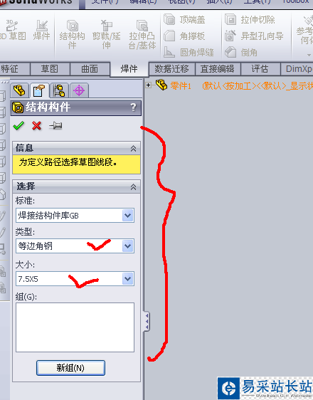 4、點擊新建組,然后選擇3D草圖中的線段路徑即可直接生成方管。