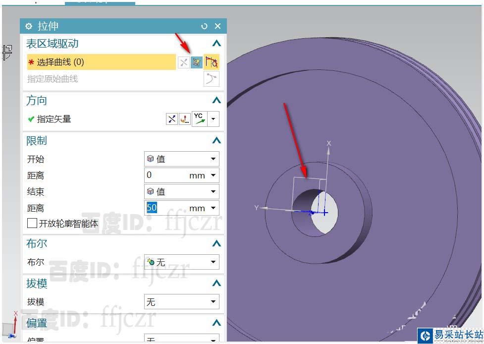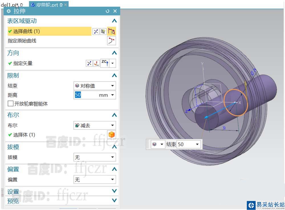 6、回到拉伸對話框,矢量方向為Z軸,拉伸方式為對稱拉伸,值為50(只要長超出皮帶輪的厚度即可)。布爾選項用減去。主體得到皮帶輪中開孔的效果。