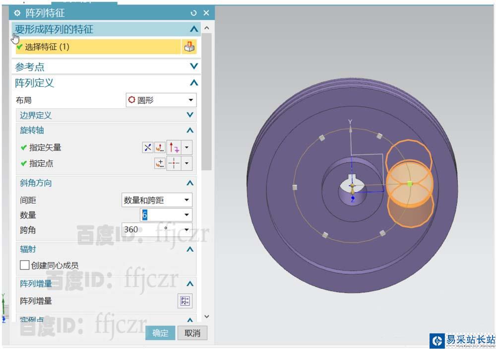 7、用陣列特征命令對上步創建的圓孔進行圓形陣列,數量為6跨角為360。得到皮帶輪的實體模型。
