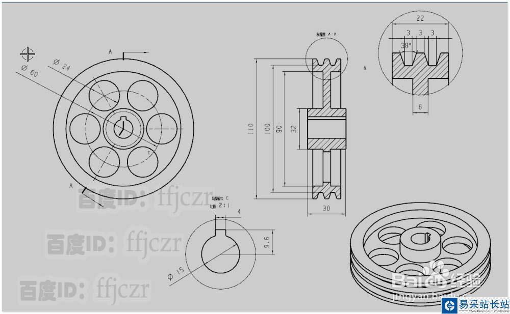 1、皮帶輪的主體可以通過旋轉命令得到,而旋轉命令所用的截面線在上次的經驗分享中已繪制完成??梢越又瓿珊罄m的工作。