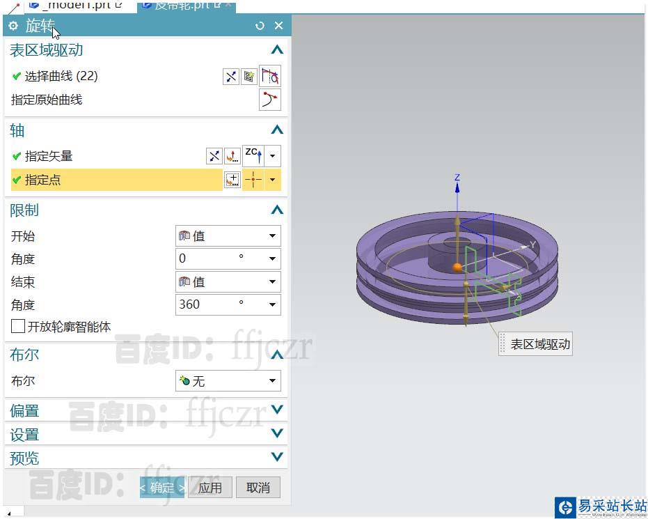 2、回到建模模式,在旋轉對話框中指定矢量為Z正向,定點為坐標原點;開始角度為0結束角度為360,確定后得到皮帶輪的主體模型。