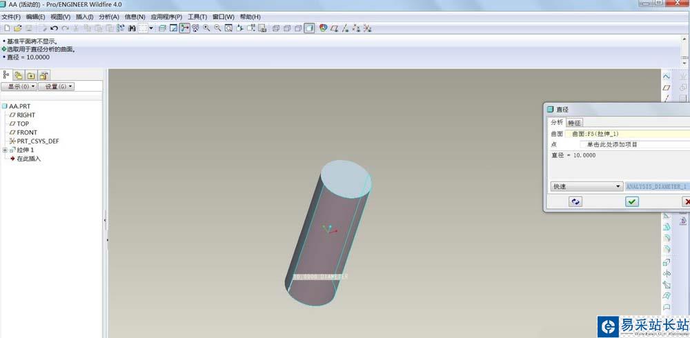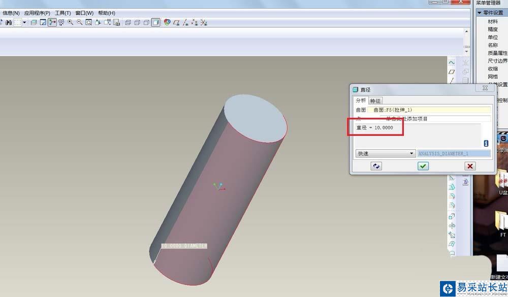 3、點一下圓柱的圓弧部分,可以看到,現在的直徑是10