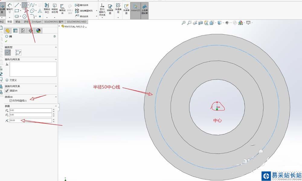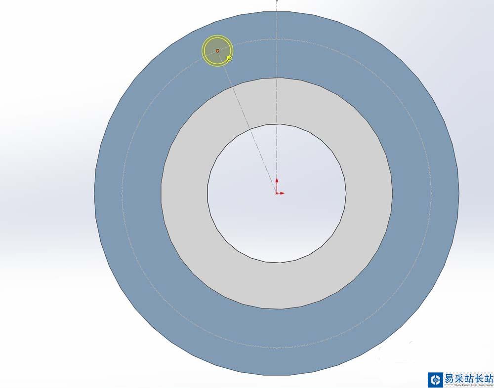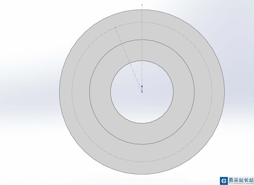 2、選擇畫圓工具,以旋轉體的中心為中心畫一個半徑50mm的圓,如圖