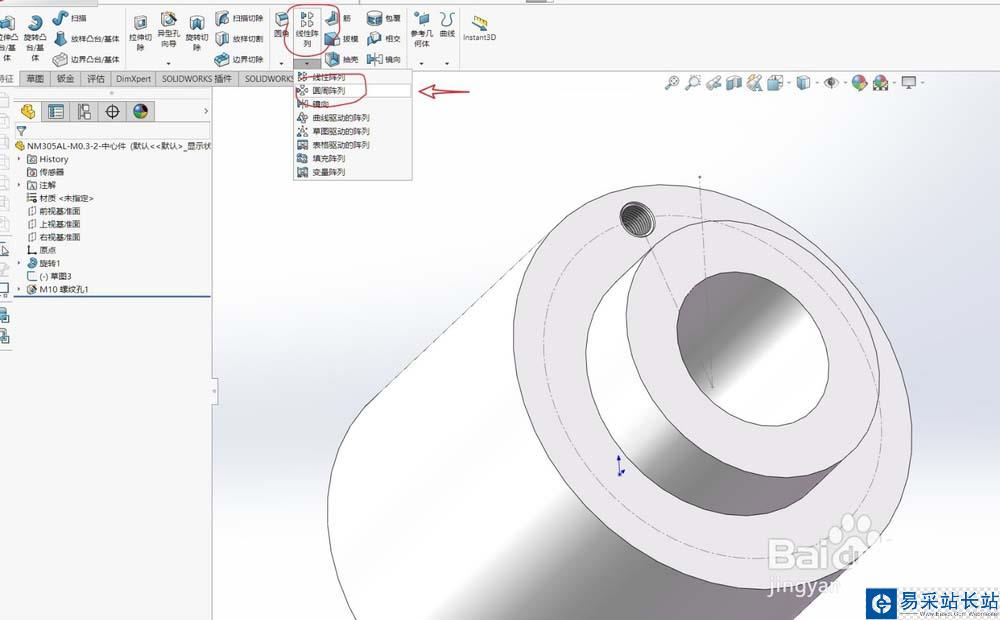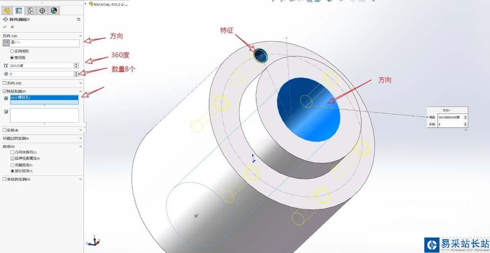 6、選擇線性陣列下拉的圓形陣列,方向選45內孔壁,角度360度,數量8個,特征選M10螺紋孔,打勾,螺紋孔就畫好了,如圖。