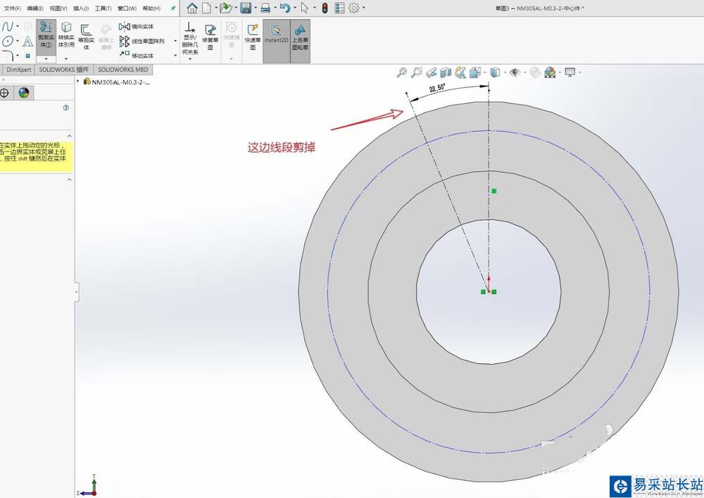 3、用中心線畫一個22.5度的夾角,凸出圖的線剪掉,畫好后選擇退出草圖,如圖