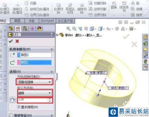 5、第一個選項點擊草圖2,第二個選項點擊草圖1,接著選擇延路勁旋轉等,最后點擊確定即可。