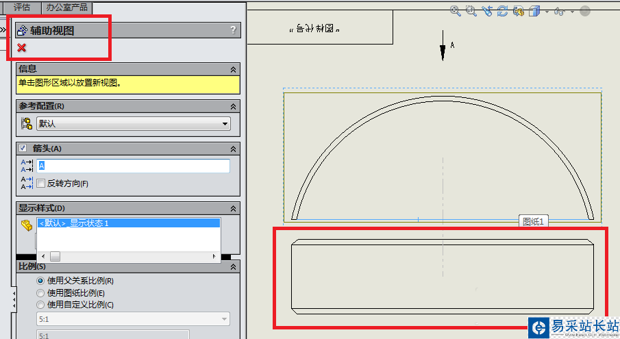5、如下圖所示,選擇位置,放置輔助視圖,當(dāng)我們 用鼠標(biāo)在工程圖中點擊之后,輔助視圖放置完畢,則表示輔助視圖創(chuàng)建成功了。然后就如下圖所示,“輔助視圖”對話框就消失了,只留下了”工程圖視圖”。