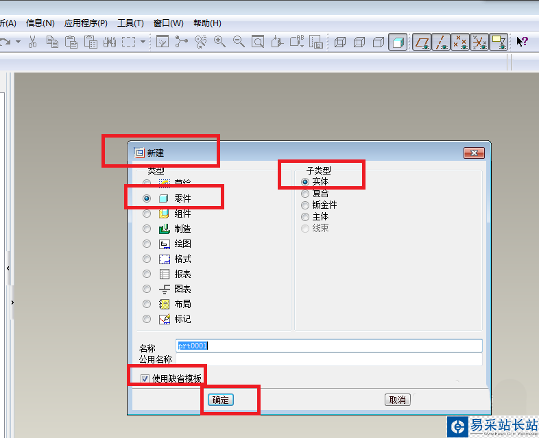1、如下圖所示,打開Pro/e5.0軟件,新建一個(gè)實(shí)體零件,默認(rèn)勾選使用缺省模板,最后點(diǎn)擊“確定”。