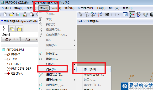 2、如下圖所示,Pro/e成功進(jìn)入到三維建模的狀態(tài),然后點(diǎn)擊工具欄中的“插入”,在其彈出的下拉菜單中點(diǎn)擊“混合”,在最后一層下拉菜單中點(diǎn)擊“伸出項(xiàng)”。