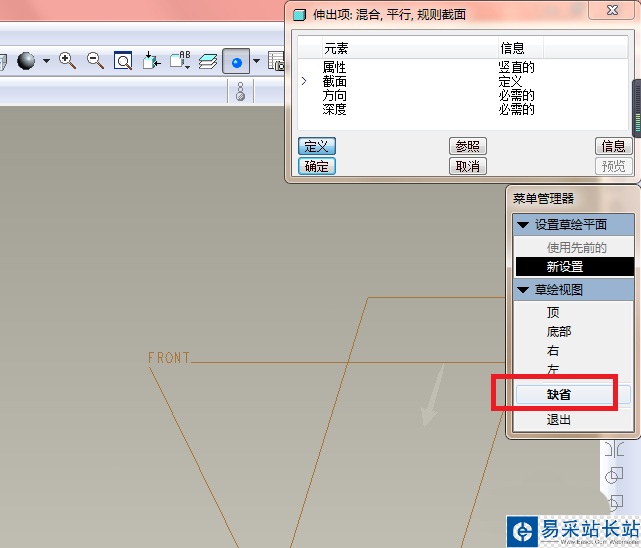 4、如下圖所示,根據菜單管理器中的要求,選擇“FRONT”基準面。