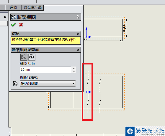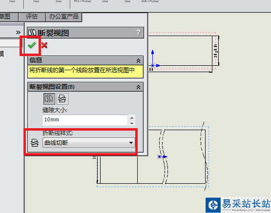 7、如下圖所示,將折斷線樣式改成“曲線切斷”,然后,點擊對話框左上角的√,完成斷裂視圖的創建。