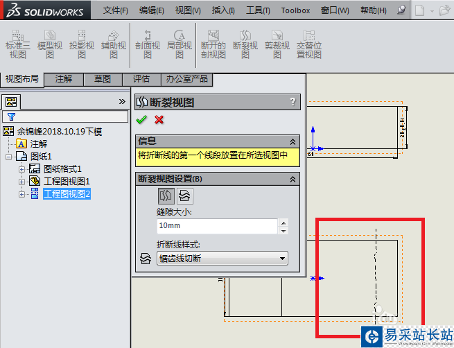 3、如下圖所示,出現“斷裂視圖”對話框,可以看到信息提示:選擇要斷開的工程圖視圖。