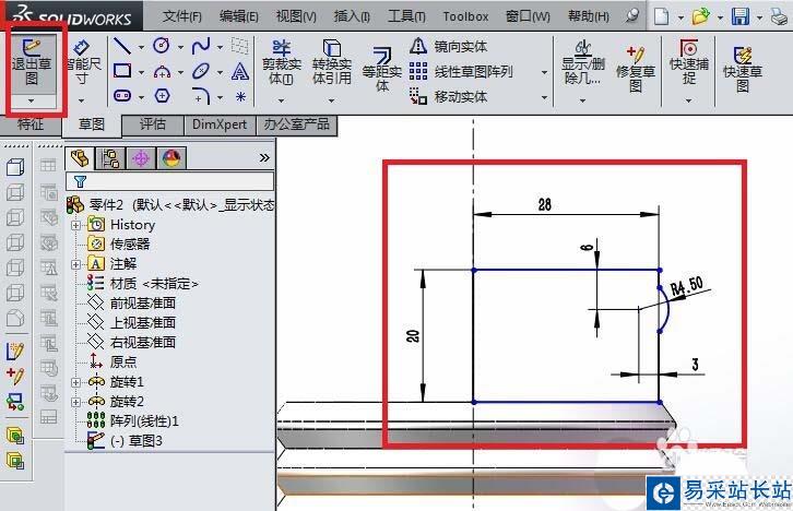 6、如下圖所示,嚴(yán)格按照?qǐng)D中尺寸畫草圖,畫好之后“退出草圖”。