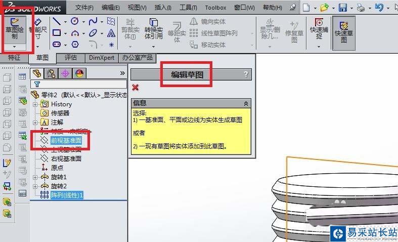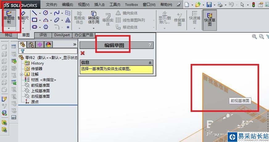 5、如下圖所示,點(diǎn)擊工具欄中的“草圖繪制”,出現(xiàn)“編輯草圖”對(duì)話框,在設(shè)計(jì)樹中選擇“前視基準(zhǔn)面”為草圖平面。