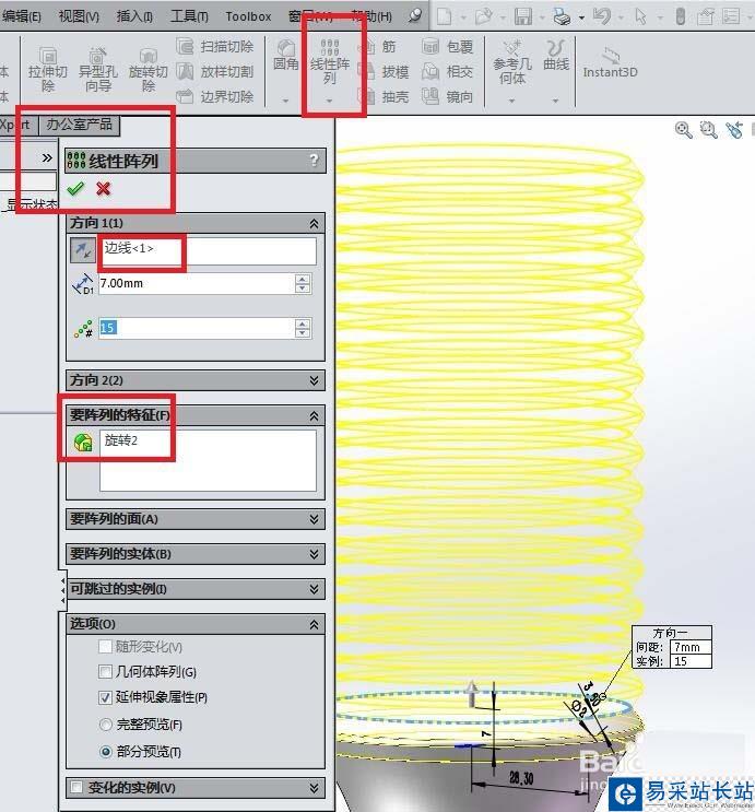 8、如下圖所示,點(diǎn)擊工具欄中的“線性陣列”圖標(biāo),出現(xiàn)“線性陣列”對(duì)話框,對(duì)話框中“方向”一欄選擇“邊線1”,“要陣列的特征”一欄選擇剛剛的旋轉(zhuǎn)實(shí)體,距離7,數(shù)量15,打√。完成線性陣列操作。