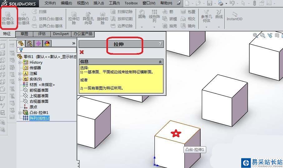6、如下圖所示,創(chuàng)建木托盤的上面木板。具體:、點(diǎn)擊工具欄中的“拉伸凸臺(tái)/基體“圖標(biāo),根據(jù)出現(xiàn)的“拉伸“對(duì)話框中的信息提示,選擇紅色五角星所在的平面為草圖平面。