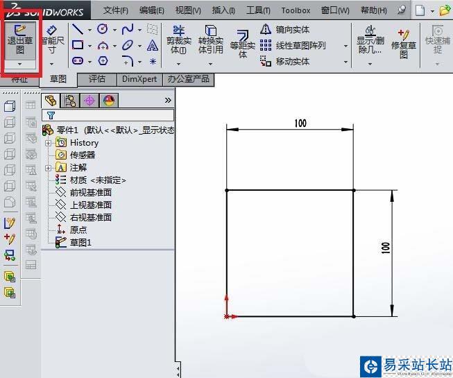 3、如下圖所示,畫木塊拉伸截面。具體:點(diǎn)擊工具欄中的“矩形”圖標(biāo),以草圖區(qū)域以坐標(biāo)原點(diǎn)為起點(diǎn)畫一個(gè)矩形,點(diǎn)擊工具欄中的“智能尺寸”,標(biāo)注尺寸為100x100的正方形,點(diǎn)擊工具欄中的“退出草圖“。