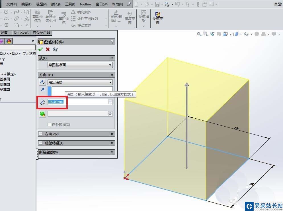 4、如下圖所示,退出草圖之后,就來(lái)到“凸臺(tái)-拉伸“對(duì)話框,設(shè)置拉伸高度為100,最后點(diǎn)擊對(duì)話框左上角的√,這樣一來(lái),木托盤中間的正方體木塊就造好了一個(gè)。