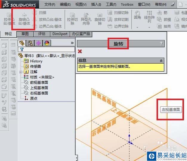 2、如下圖所示,首先點擊工具欄中的“旋轉凸臺/基體”圖標,然后在彈出“旋轉”對話框和三個基準面面之后,選擇“右視基準面”為草圖平面,然后軟件就自動進入到草圖環境。