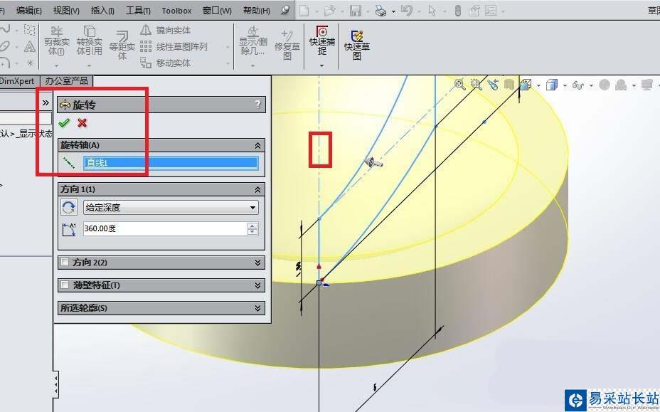 4、如下圖所示,回到了“旋轉”對話框,選擇紅色框選所在的那條中心線為旋轉軸,然后點擊對話框左上角的√,完紐扣的主體創建。