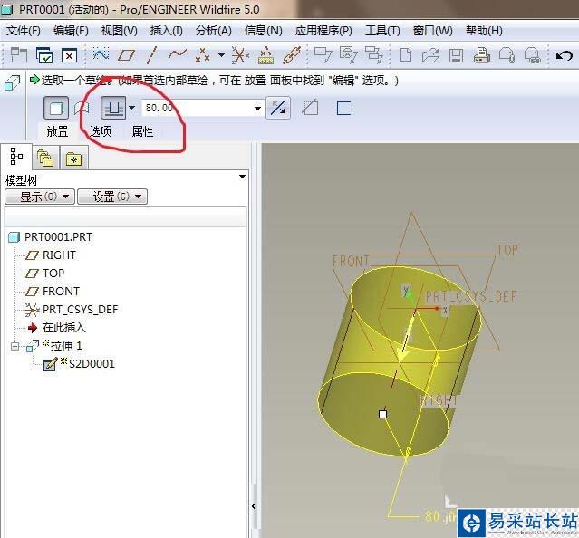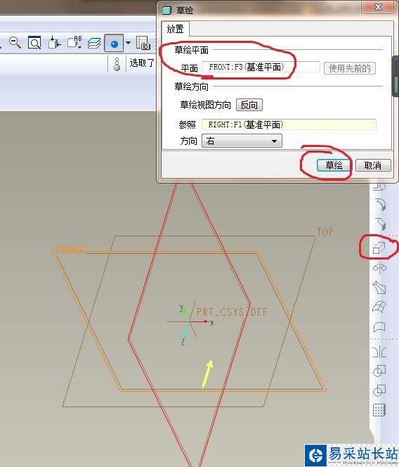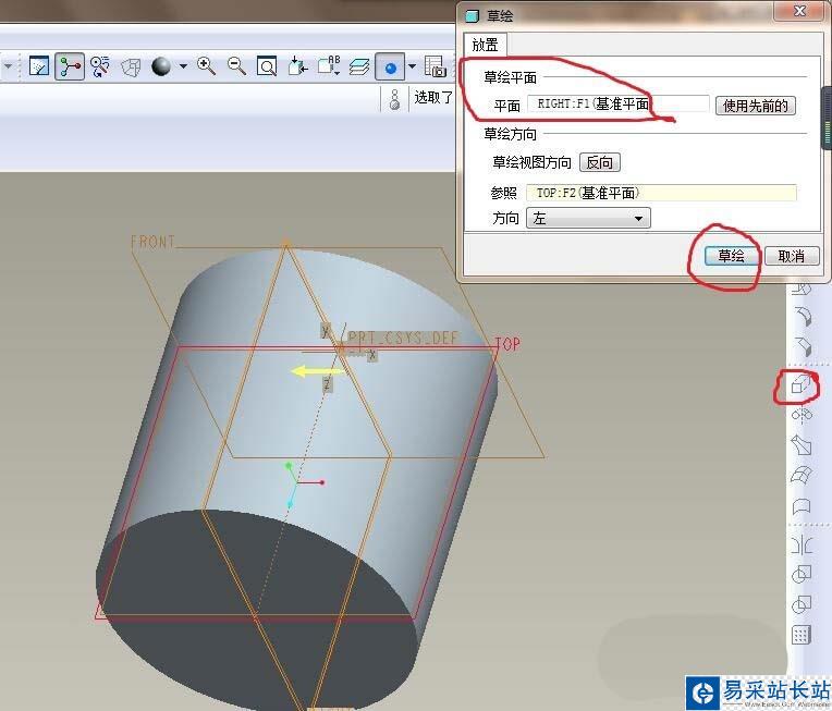 5、如下圖所示,執行【拉伸——放置——定義——RIGHT面——草繪】。