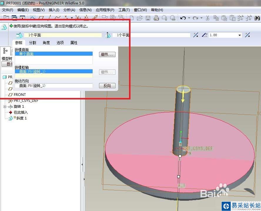 4)點(diǎn)擊“拔模樞軸”一欄,再點(diǎn)擊實(shí)體中的圓柱底面,